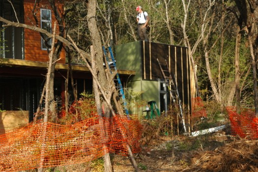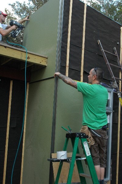shelter crew is applying the MDO. it looks great with each piece seperated by flashing.