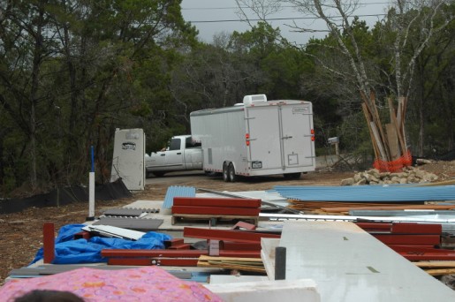 spray in insulation foam guys returned. they have a big trailer, the street is narrow and steep. our driveway has it's own challenges. it took a good long time and several attempts to get in. the trailer did have a brief meeting with those rocks protecting the tree. damage looked like it could be reversed with a few precise whacks from a rubber mallet and some new trim screws. I'm sure it didn't make him any less anxious to have four of us yelling "turn your wheel the other way!!! WHOA, now go forward, NO! FORWARD." later, when leaving, I found his mudflap in laying in the driveway. meanwhile down at the spare parts pile....