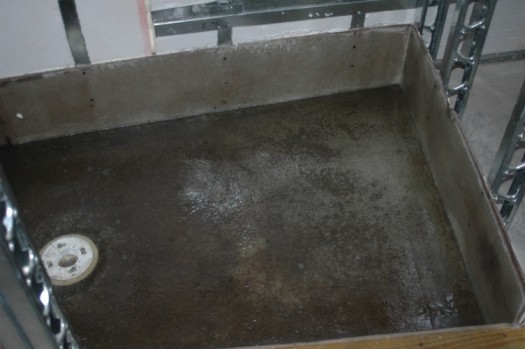 the shower pans have been fiberglassed and ready to be filled with water to show inspector their waterproofness.