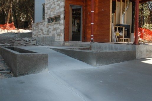 the new approach to the house, ramp and planter boxes. the crew has buttered up the voids and gave it all a nice smooth surface.