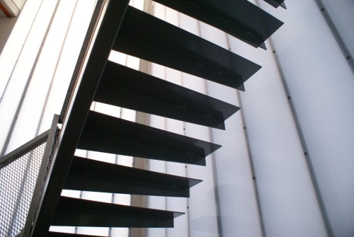 I love our stairs.  they sort of hang there.  attached on one side only.  the translucent wall sections compliment this feature.  we intend to cover the treads with cork or anything that is slightly more forgiving than the steel.