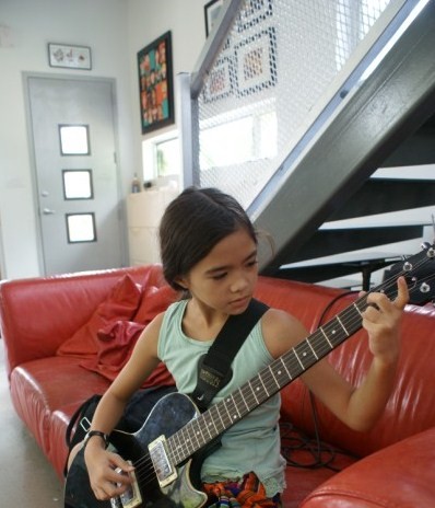 my daughter is doing SO WELL at guitar.  she is now learning her third song. her teacher (tony at austin guitar school) has assured her that he's good at instructing people to sing while they play.  she is shy and first declined his offers.  tony and I were both a bit surprised when she started to sing.  she sang as she played FOGGY EYES by BEAT HAPPENING