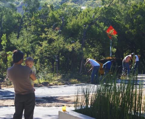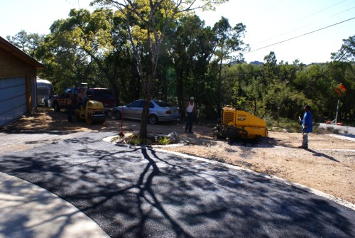 heard the doorbell yesterday. a guy in a truck claimed to be finishing a road project nearby and had an extra truck of blacktop and offered a price on our driveway. kat has always wanted an asphault driveway, she has a birthday approaching so I called her to decide. of course she wanted it. one hour later a crew arrived and got to work. she came home to supervise the realization of her dream.