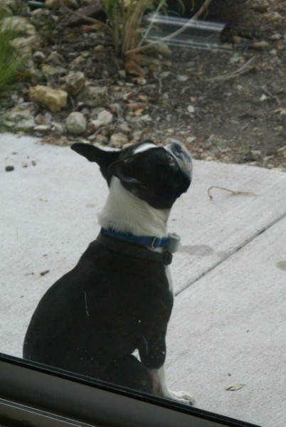 marvin was trembling with excitement and the cool weather. eichler didn't care about the racoon and she was sleeping in her box. the racoon eventually climbed to the tip of a branch and was near getting on the roof. marvin moved his guard post to inside while I got a pole and poked at the racoon. eventually the racoon jumped/fell and ran into the woods. poor marvin was so tired he didn't even notice. I went back down to find him still looking up the tree.