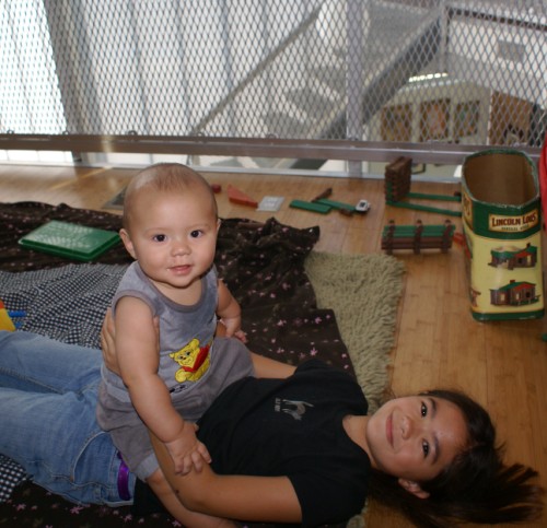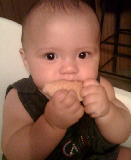 he's using those teeth to enjoy pizza crust. he's wearing a onesie we purchased for the daughter when we were in playa de carmen to celebrate her 1st birthday. she wore it till she was about 2 yo. he's 6 months and it fits him perfectly.