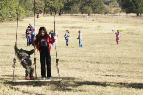 kids enjoyed the swing. unfortunately, the girl in the background had just fallen while running and broken her arm. she had to be rushed to the hospital.