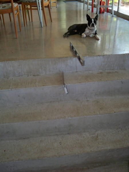 the steps up to the dining/kitchen area from the entry/living room were very shallow. the inspector had told me I need to add a miniumum of one inch lip. after much head scratching and several different methods considered, we chose cedar 2x6. I tapered the bottom and beveled the edges. this extends the tread by almost two inches. we like the way the wood looks and once we carpet the top of each step, it should also help with our noise travelling issue.