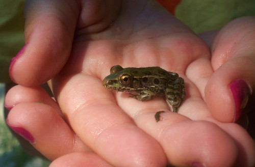daughter caught a frog that has not yet moved out of the tadpole pond.