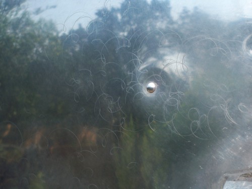 I was too late. the lid was not screwed down and the bottom fell to the ground. that stuff is not cheap. I tried to salvage what I could. resumed my polishing and then I noticed the squiggly line I had applied to about one sq ft of aluminum. yep, picked up a rock. this is what 1 grit sand paper looks like on aluminum. I got out some wet dry 2000 grit and worked my way through the compounds... still there. some day I'll try starting at 500 grit. but for now... we have squiggly lines. it is a small patch between the door hinge and window. at least it won't be seen when the door is open.