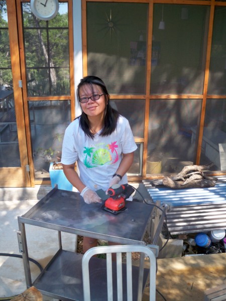 we are getting the outdoor items ready for summer fun. kat applying some 2000 grit wet/dry sanding action to the stainless steel cocktail cart we got from a hospital salvage operation.