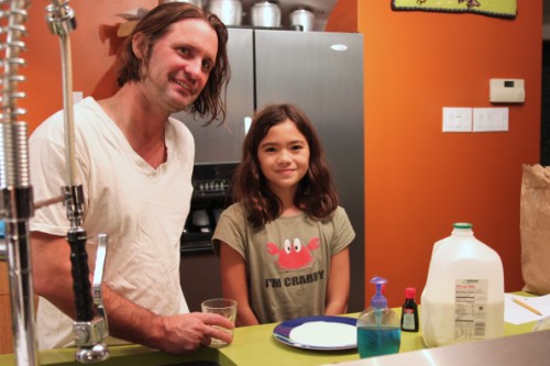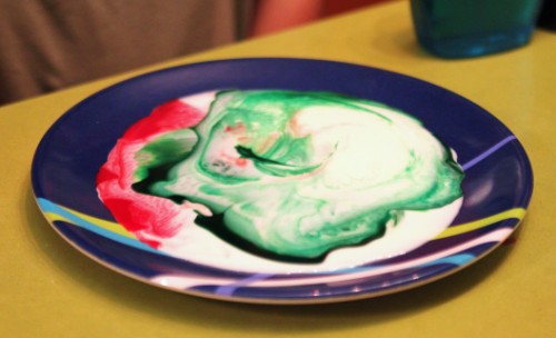daughter had to do an experiment. milk in a plate, a drop of red food coloring and a drop of green, then add a drop of dish washing detergent...