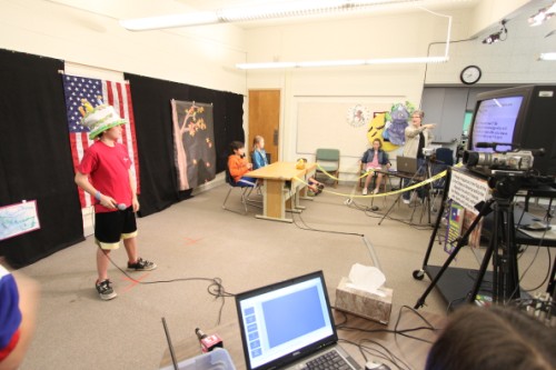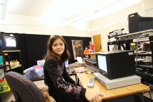 they announce what is on the lunch menu, birthdays and made a special request for kids who might have a fever to please stay home, "we'll miss you but we won't miss getting sick". kids control the cameras, the music (my daughter is on music duty this week), teleprompter etc.. the program is concluded with a "moment of silence". this time is used to display featured art work from a student and play classical music. a nice way to start the day of learning.