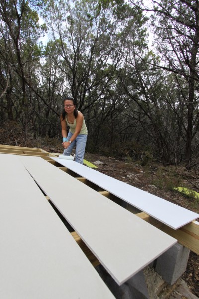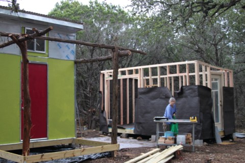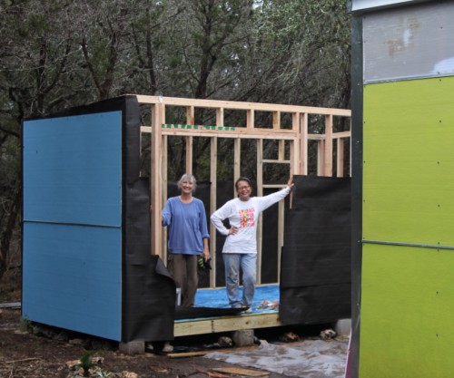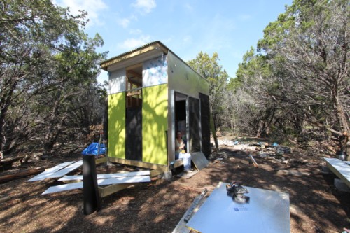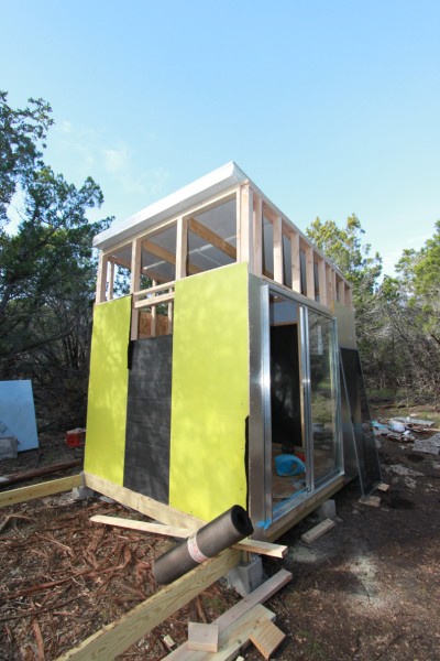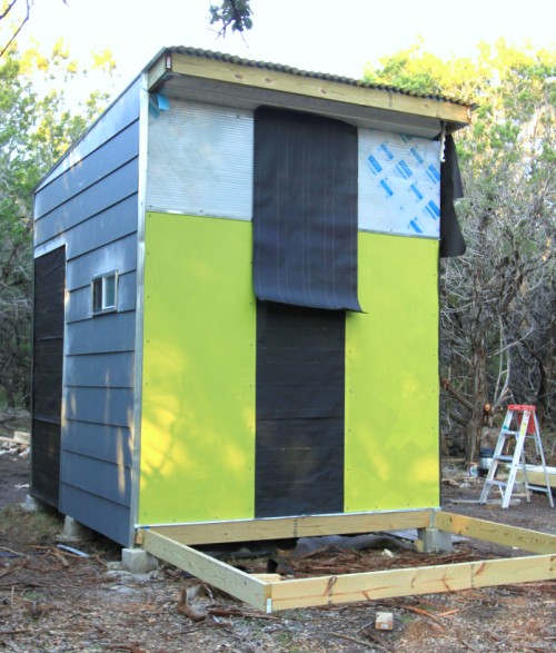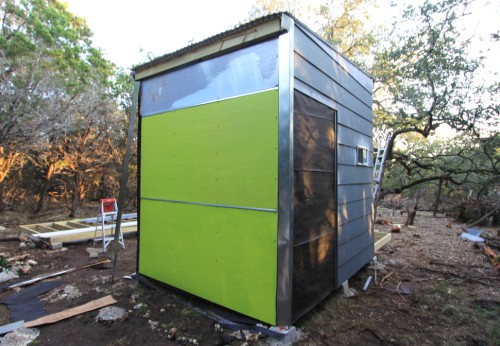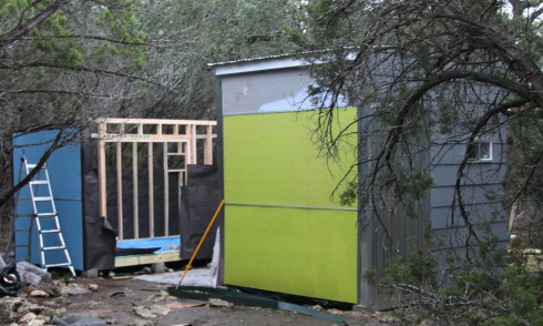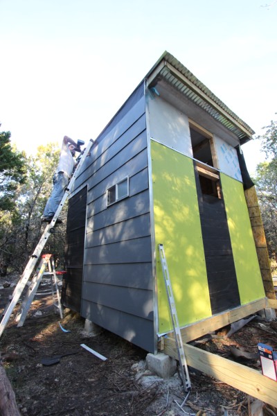 I cut down the old construction door from austinmodhouse to fit the cabin. testing paint colors and we are not settled on this cranberry, looks a bit too much like purple. also have decided to paint the hardie that is up high around that window in white.