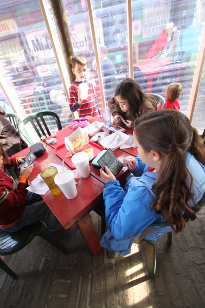 we made a quick pit stop at the ghost room before the parade. kat enjoyed some quality time teaching the older two to play pool.