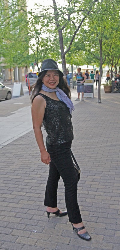 kat enjoying her vintage top she got from the yelp sxsw party.