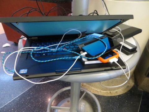 we found ourselves with 5 hours to kill in LAX. that airport is stuffy and crowded. there was fierce competetion to find a USB charging station. we found a work around, plug in the laptop to the open USB, that gave us 4 USB ports.